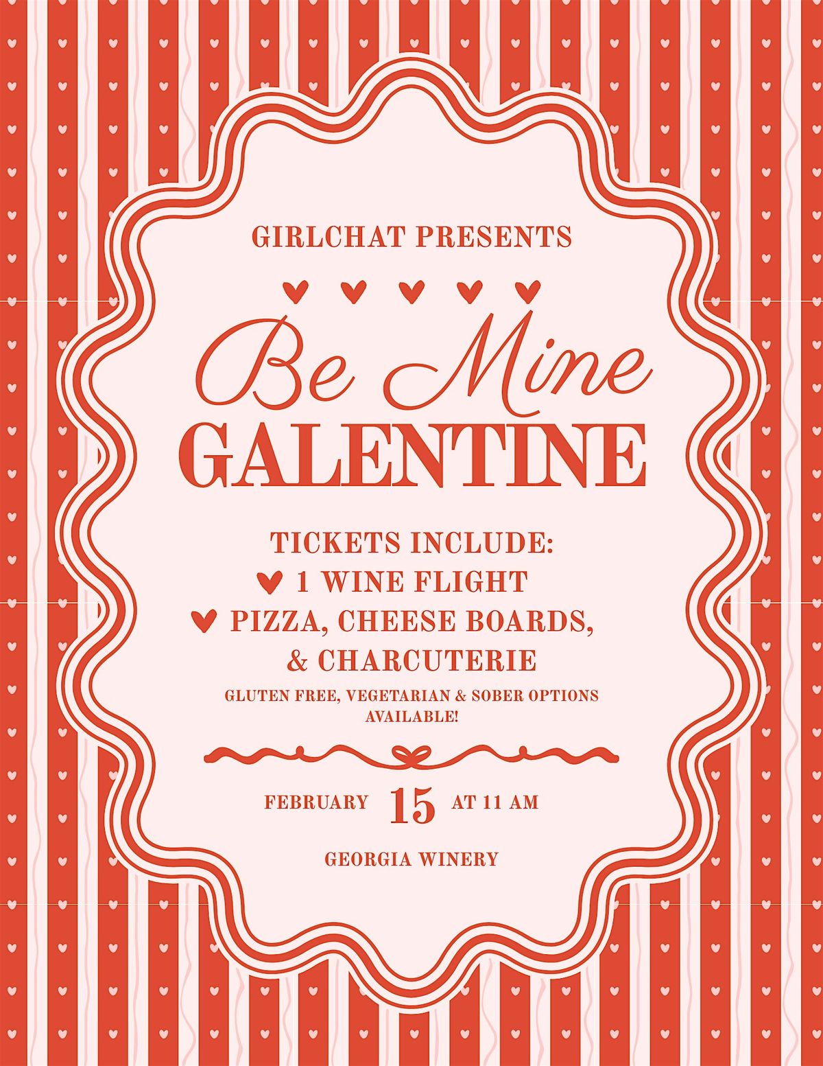 Join us for an awesome in-person gathering of gals celebrating friendship and fabulous wines! Be Mine Galentine is all about sipping, chatting, and enjoying good vibes with your favorite crew. Whether you're a wine newbie or a seasoned sipper, come ready to taste, laugh, and make some unforgettable memories. Let's toast to friendship and have a blast with girlCHAT guiding the fun!