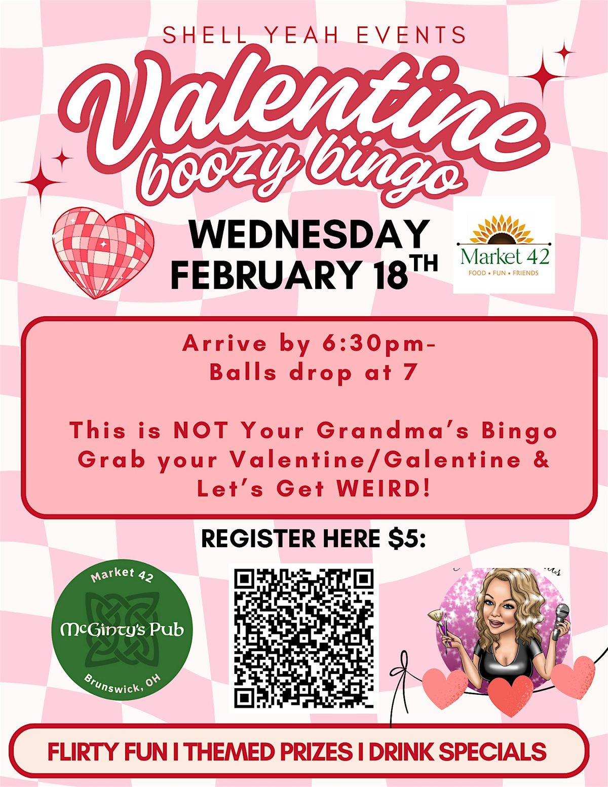 Please note this is bingo for ENTERTAINMENT PURPOSES only in compliance with Ohio law there are no cash prizes.Doors open at 6 pm & Balls start droppn' at 7pm. Typically we bingo for about two hours. Come hungry, thirsty and ready to support a small business, Market 42 & McGinty's Pub!