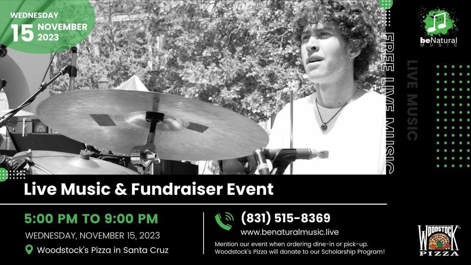 Be Natural Music ? will continue the concert ? and fundraising ? season by showcasing their youth ? Rock ? and Jazz ? bands at Woodstock’s Pizza ? in Santa Cruz ? on the evening of Wednesday, November 15th ?. Local residents ? are invited to drop by, grab a bite ?, and enjoy the music ?. Attendees must mention that they’re “here for the Be Natural Music event” ? at the register ? in order for our scholarship program ? to receive their donation ?.Woodstock’s Pizza ? is continuing their support ? by donating up to 25% of its proceeds ? from the shows to our fundraiser: The scholarships ? help families ???? in financial need afford music ? classes for all ages ??.