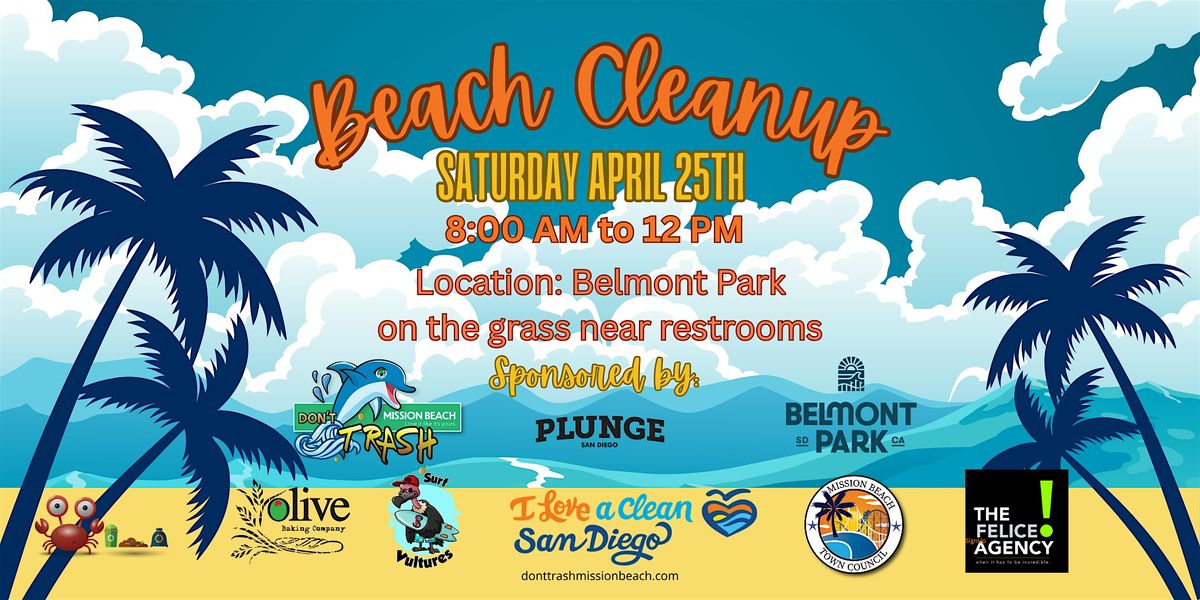 Event sponsors include I Love A Clean San Diego, the Mission Beach Town Council, Belmont Park, The Plunge, the Felice Agency, Olive Baking Company, Surf Vultures, and Don't Trash Mission Beach.