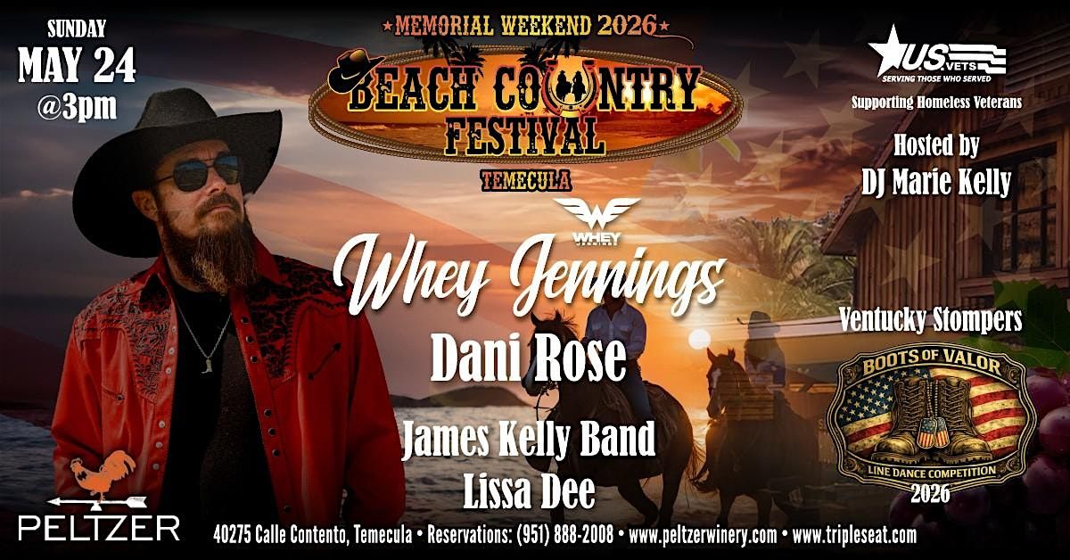 Come out to Peltzer Winery for our 3rd Annual Beach Country Fest featuring Whey Jennings, Dani Rose along with special guests James Kelly Band and Lissa Dee. The DJ and host for the event is Marie Kelly. We will also be having the Boots of Valor Line Dance Competition by the Ventucky Stompers. We will be raising money to support homeless veterans. No refunds or exchanges. The dance competition is open to the public and is available for all levels. There will be cash and prizes at each of the events with a grand prize at the end. Register here on eventbrite!! Registration prices will go up as space in the competition is limited.