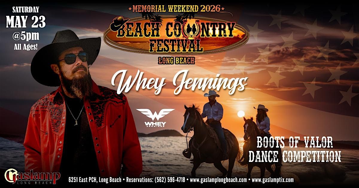 Come out to Gaslamp Long Beach for our 3rd Annual Beach Country Fest featuring Whey Jennings and Boots of Valor Line Dance Competition brought to you by the Ventucky Stompers. Event is all ages!!There is free parking before 6PM $20 after. We will be raising money to support homeless veterans. No refunds or exchanges. The dance competition is open to the public and is available for all levels. There will be cash and prizes at each of the events with a grand prize at the end. Register here on eventbrite!! Registration prices will go up as space in the competition is limited. There will be no onsite registration for Boots of Valor Line Dance Competition.