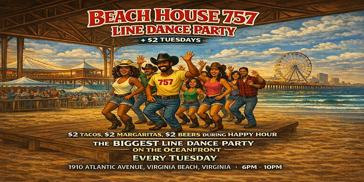 Get ready for the Beach House 757 Line Dance Party + $2 Tuesdays, the biggest line dance party on the oceanfront! Join us every Tuesday night at Beach House 757, located at 1910 Atlantic Avenue in Virginia Beach, for a fun, high-energy night of music, dancing, and great drink and food specials.