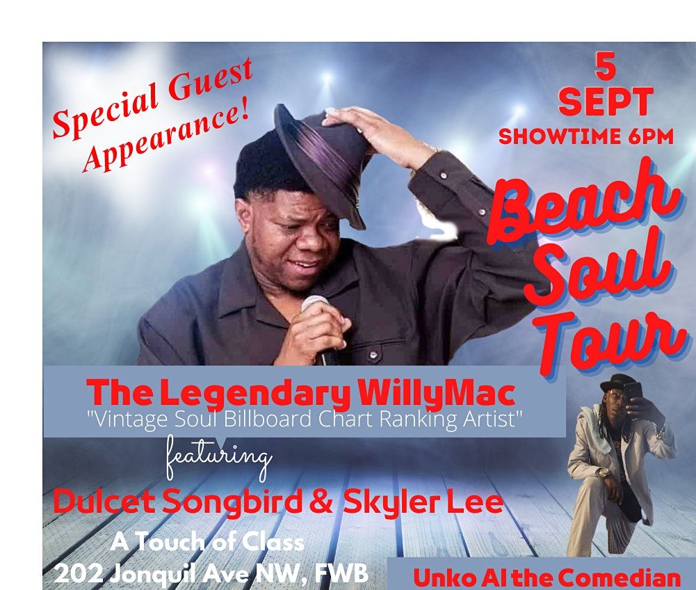 The Legendary WillyMac a Vintage Soul Billboard Chart Ranking Artist, with hit songs "Can't Take It No More," "Tell It Like It Is", " Tonight is the Night," and "Ain't Messin' with Y'all" will be performing at A Touch of Class in Ft. Walton Beach. Show will feature Cazanova The Rembrandt and be hosted by Unko Al The Comedian. Audience will also sample hearing upcoming artists: Dulcet Songbird and Skyler Lee. This will be a show you DO NOT want to miss!