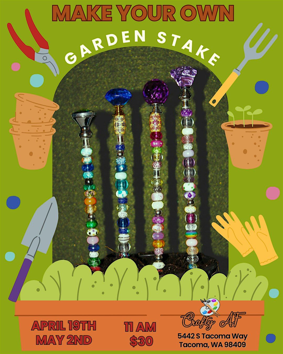 Participants will create a 12-inch beaded garden stake using a threaded rod, European large hole beads, and a nut to keep everything in place. Attendees choose their stake topper and beads from many color options. These garden stakes are great for adding extra sparkle to flowers bed or even potted plants.