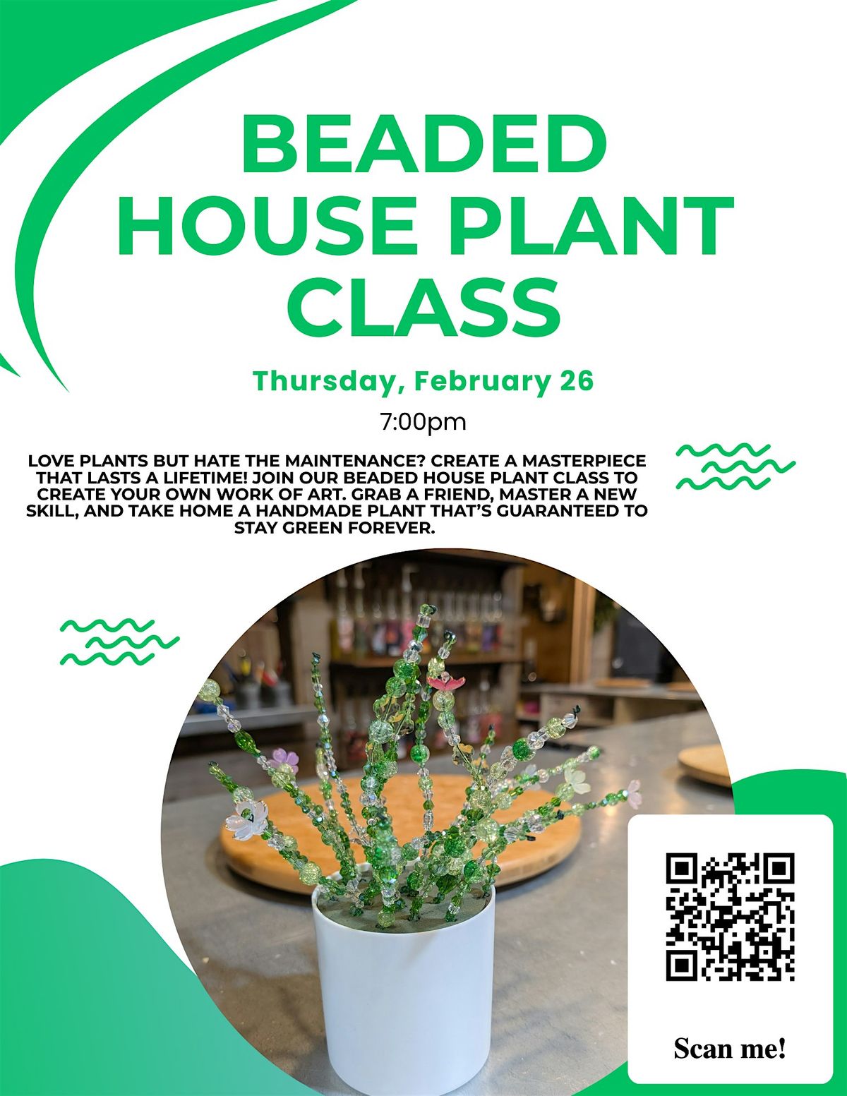 Come join us in person for a fun and crafty evening! Learn how to create your very own beaded house plant that’s perfect for brightening up any space. No experience needed – just bring your creativity and good vibes. It's a great way to unwind, meet new friends, and take home a unique handmade piece. Don't miss out on this cool chance to get crafty and colorful!