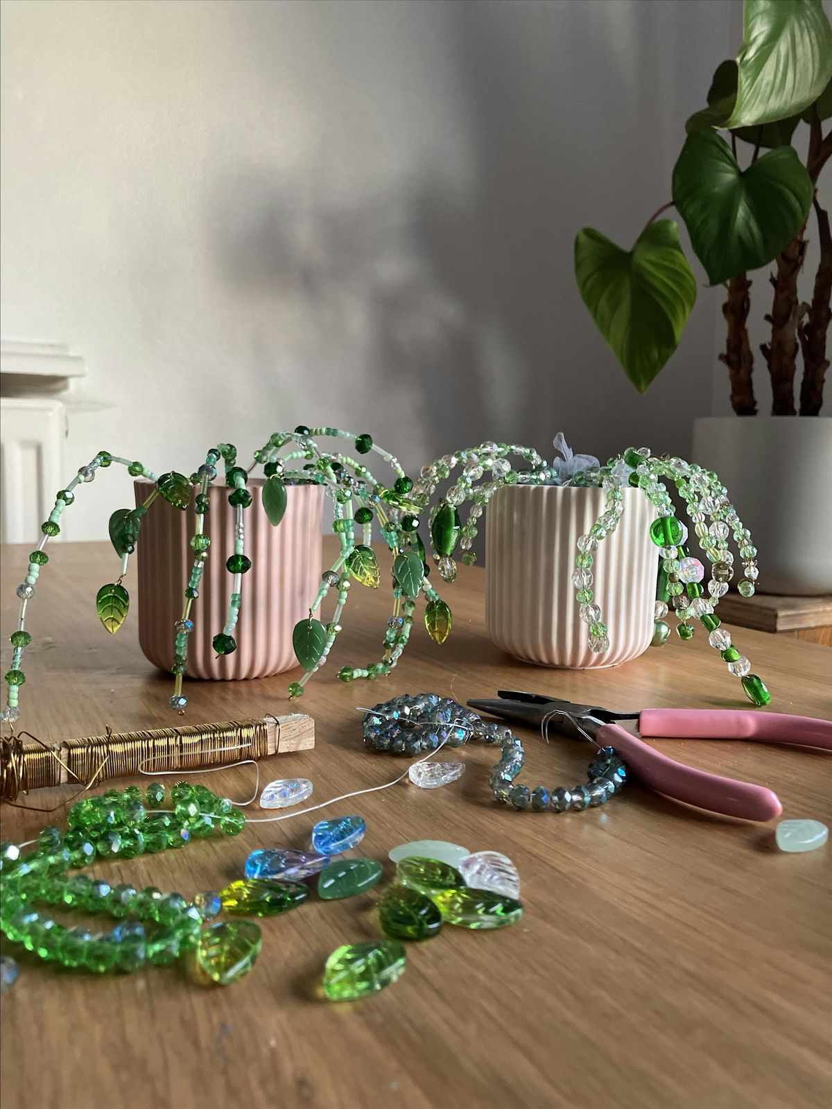 We will be working with a glittering selection of glass, ceramic and and acrylic beads and charms to create your very own beaded houseplant. Pop them on a shelf or hang them in a plant hanger and enjoy the sparkle as the sun catches all the facets on the beads. The perfect item of home decor if you’re not particularly green-fingered- no watering required!