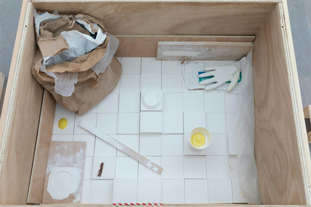 Joanne Reid. Crate (for display purposes only), detail, 2024. Plywood, timber, powder coated steel, cast plaster, paper cups and lid, cast Jesmonite, plaster powder, sawdust, painted steel, laminated cotton dust sheet, used latex gloves, empty sugar sachets, empty plaster bag, wooden stirrer, paper straw, plastic builders film. Photo: Lee Welch