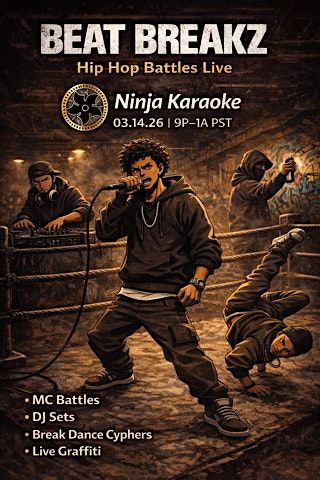 Las Vegasβs Arts District comes alive as Beat Breakz takes over Ninja Karaoke for a night of raw hip hop energy. Headliners Upgrade and Henny Holyfield lead the charge, with opening acts Rene and Vessel setting the stage on fire. The night goes deeper with a live music production segment featuring Noewan and Weirddough, giving you a front-row look at beats being built in real time.