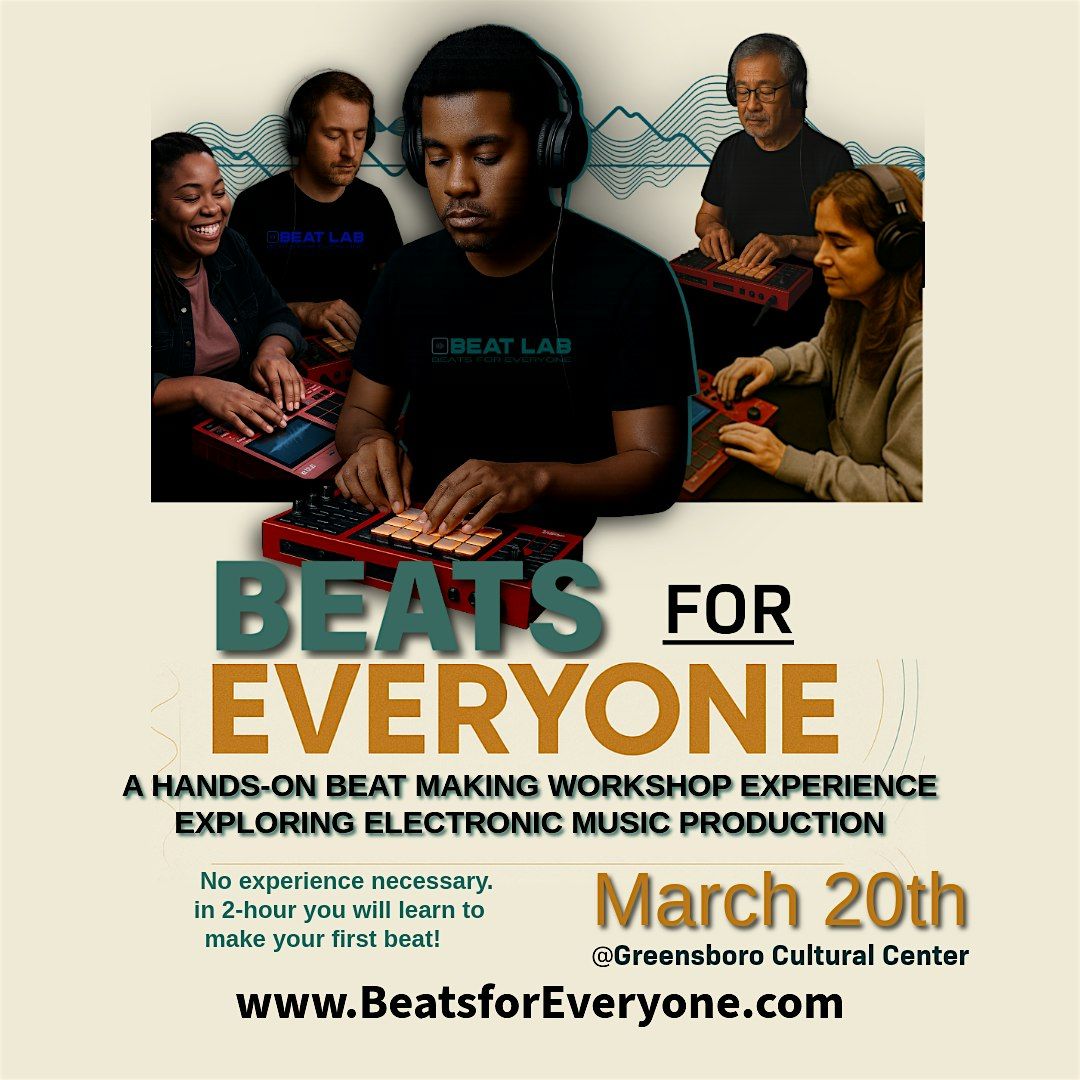 Join us on March 20, 2026 in the BEATLAB at Greensboro Cultural Center for a fun and educational beat making and electronic music production workshop! Whether you're a total beginner who never played an instrument or a musician who wants to explore electronic music, Beats for everyone is a hands-on and crateive expreience. Bring your energy and let's make some beats together in a relaxed, friendly vibe. Don't miss out on this awesome chance to dive into music production!