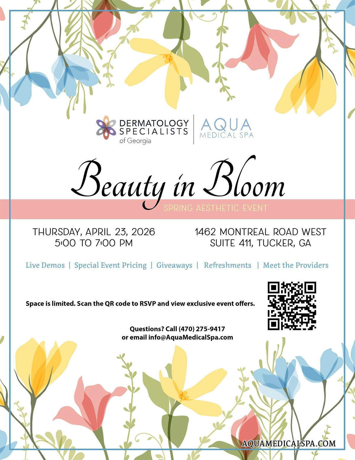 Spring is in full bloom, and so is the chance to refresh and rejuvenate at our Beauty in Bloom: Spring Aesthetic Event in Tucker! Join us on Thursday, April 23rd from 5β7 PM for an exclusive evening of live demos, giveaways, refreshments, and special event pricing. Meet our expert providers and brand representatives while exploring the latest in aesthetic treatments and skincare.