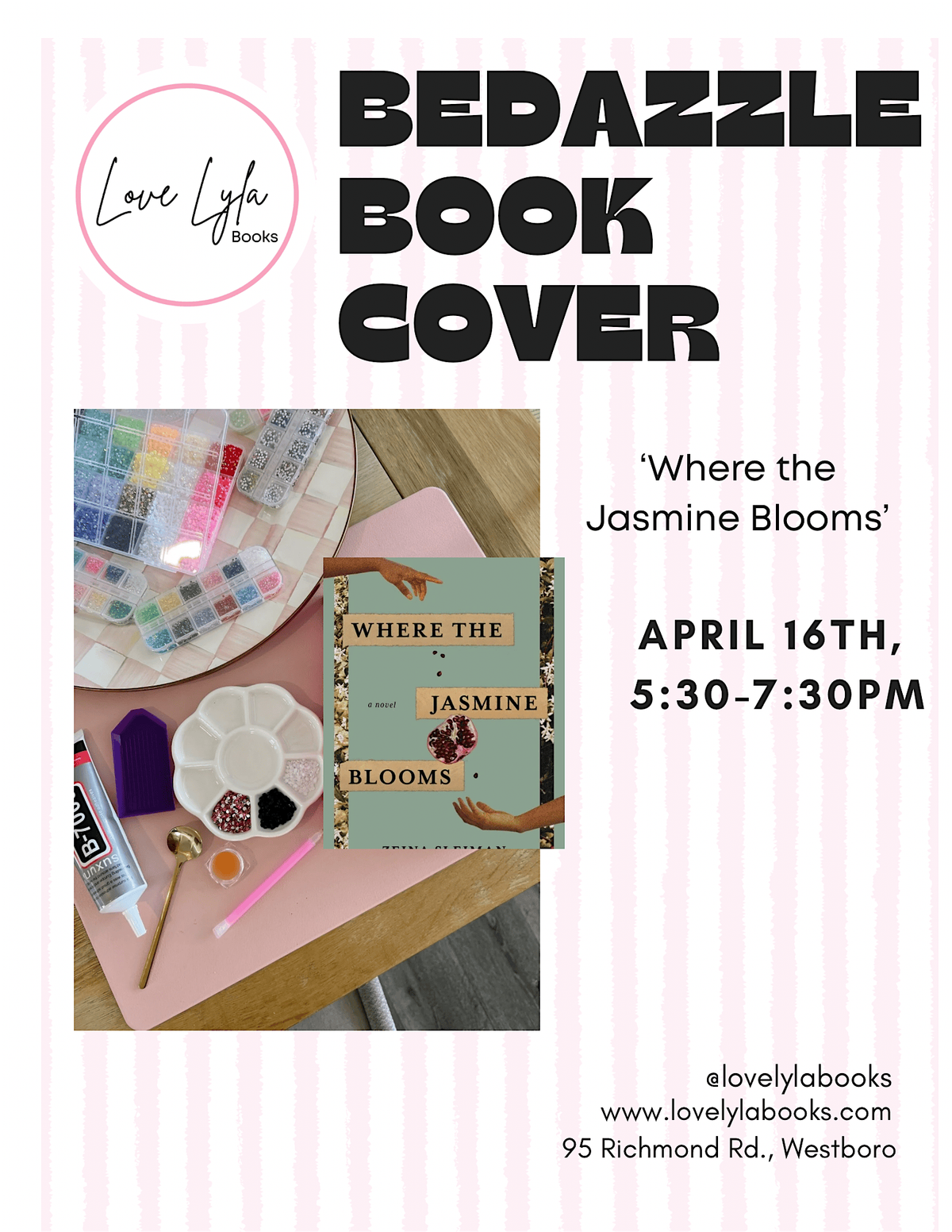 Join us for a fun in-person event where you can get creative and add sparkle to the 'Where the Jasmine Blooms' book cover! Whether you're a book lover or just love a bit of bling, this is your chance to make a cover truly shine. Bring your friends and let’s get crafty together!