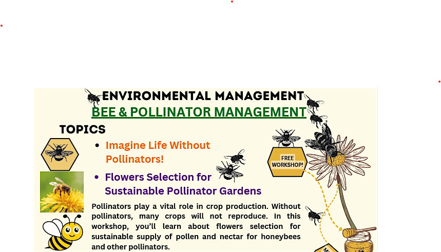 Pollinators play a vital role in crop production. Without pollinators, many crops will not reproduce. In this workshop, you’ll learn about flowers selection for sustainable supply of pollen and nectar for honeybees and other pollinators.