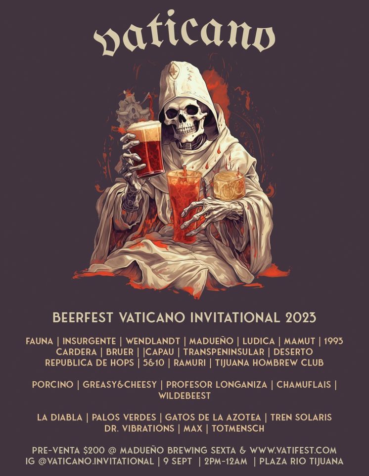 El Vaticano Invitational 2023 es un festival de Cerveza Artesanal que busca capturar la escencia de los beerfests originales. Se llevará a cabo este 9 de Septiembre a partir de las 2 PM en el estacionamiento del Centro Comercial Plaza Rio Tijuana (frente a farmacia Gusher). Contaremos con invitados muy selectos mediante los cuales podrán degustar la mejor calidad de cerveza que han puesto en alto a la Baja y el resto del país en estos últimos años.