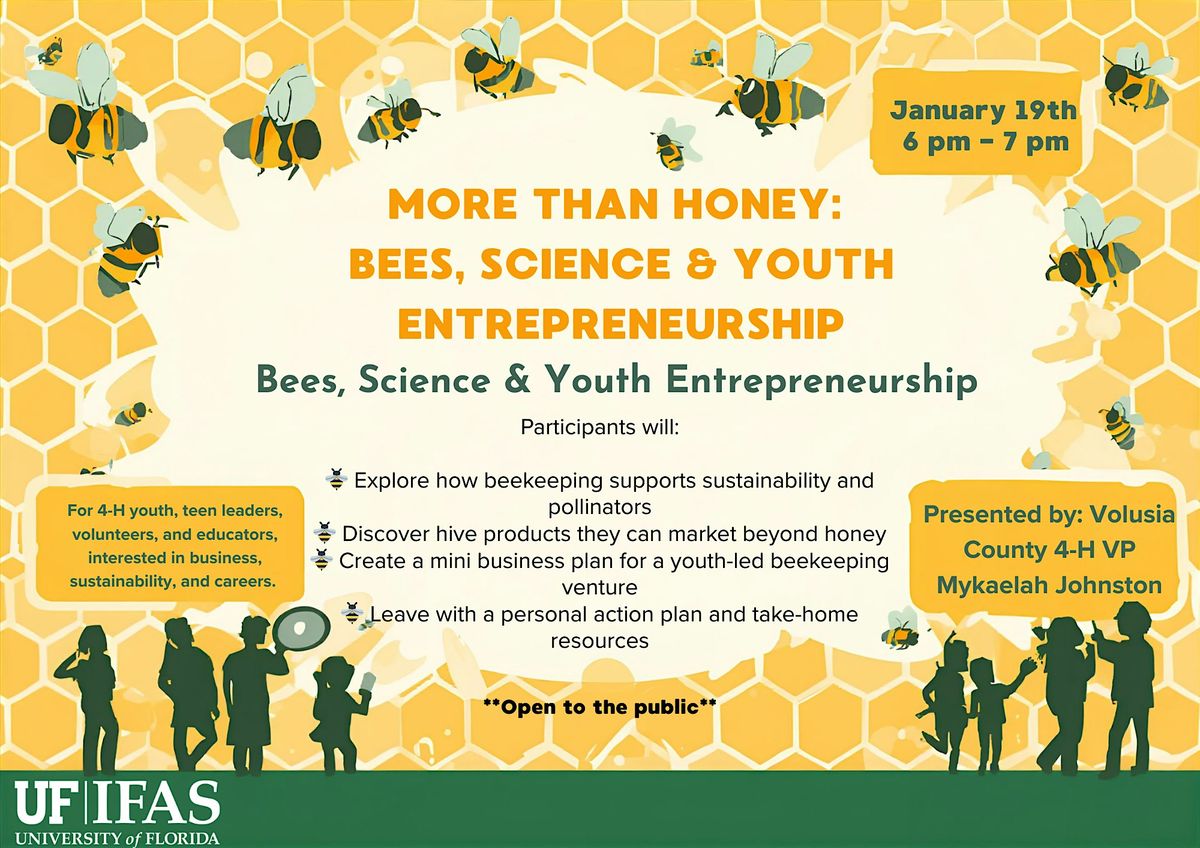 Presented by Volusia County 4-H Vice President Mykaelah Johnston. Join us as she helps us explore how beekeeping supports sustainability and pollinators