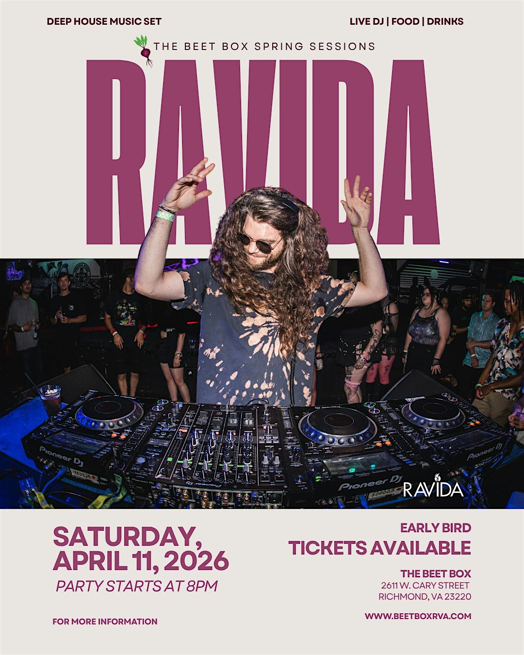 Join us on April 11, 2026 at 8:00 PM (Eastern Time) for an epic live set by Ravida spinning the best house beats. Whether you're here to dance or just chill with friends, this is the place to be. Don't miss out on a fun evening with great music, food + drinks, and good company!