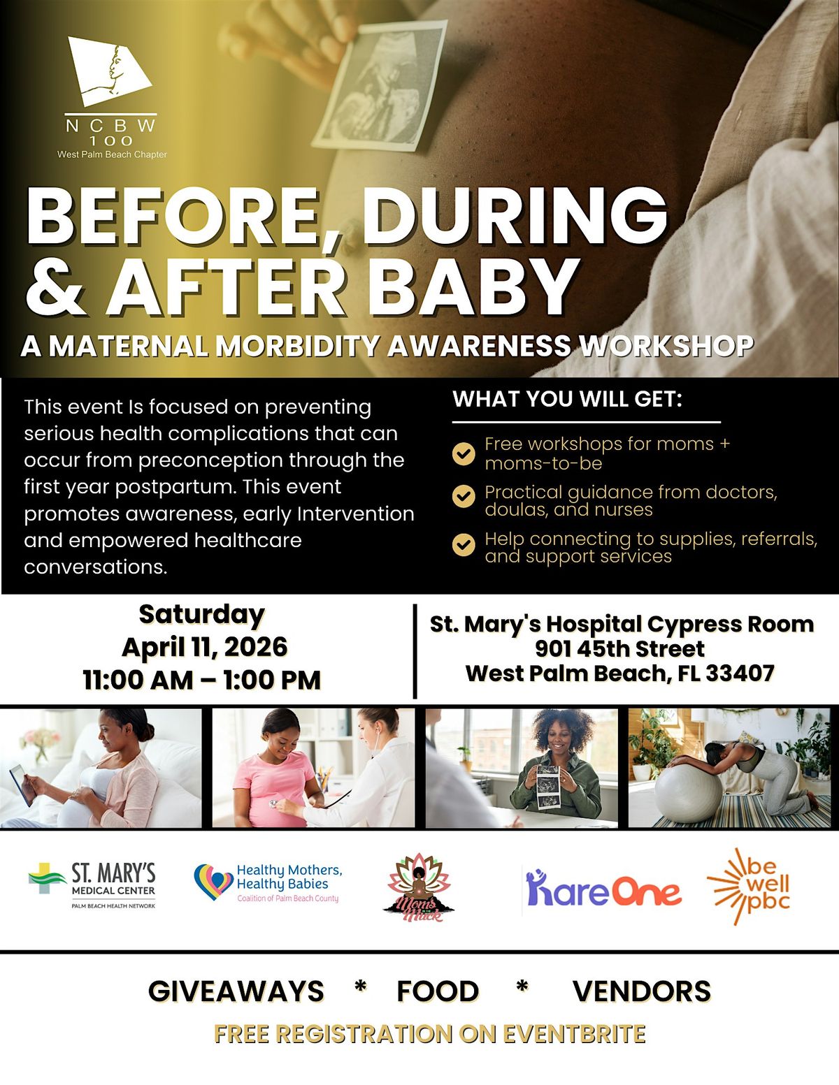 This free workshop for moms and moms-to-be is focused on preventing serious health complications that can occur from preconception through the first year postpartum. This event promotes awareness, early Intervention and empowered healthcare conversations. You wilI receive supplies, referrals and support services.