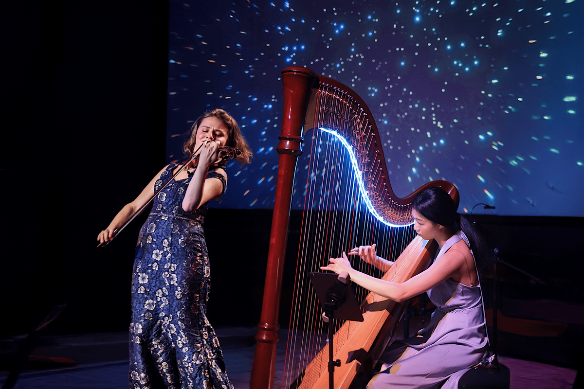 This is a participatory multimedia performance created and performed by harpist and composer Renée Qin, with artists from Sound Palette.