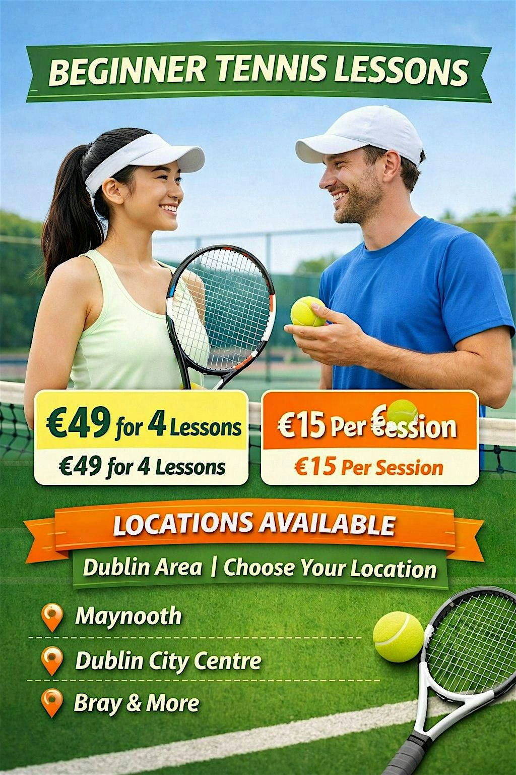 Join our Dublin Beginner Tennis Course, designed specifically for complete beginners and novice players. Our goal is to make tennis fun, safe, and easy to learn, while giving you the skills and confidence to enjoy the game.