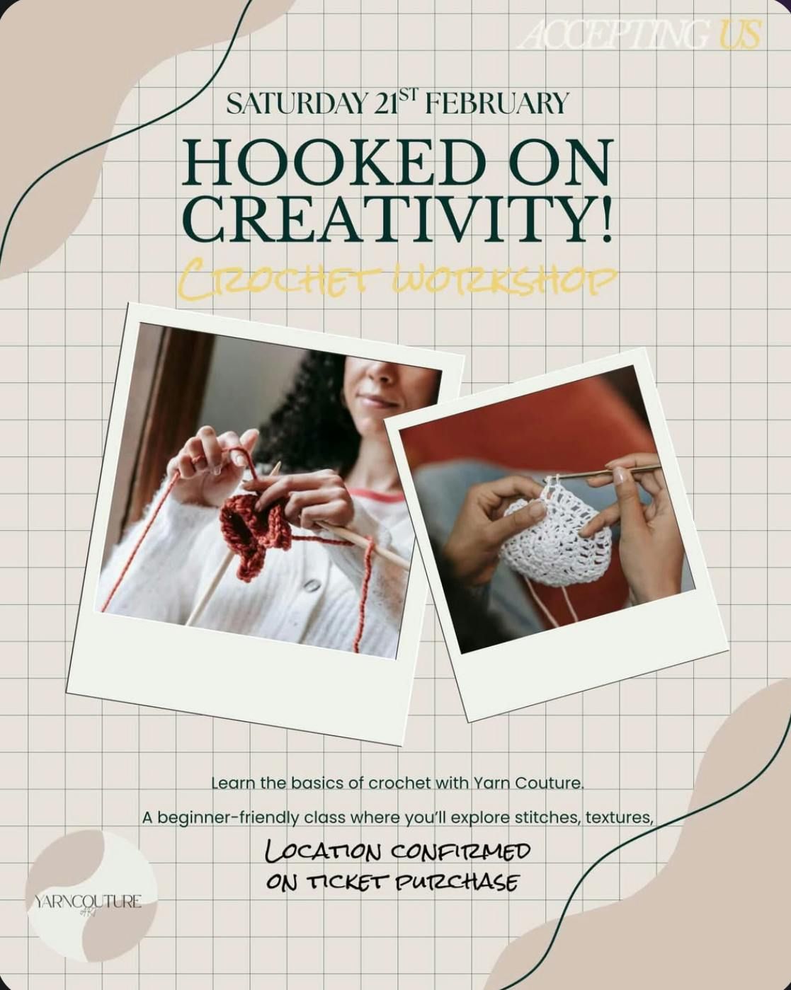 **Beginner Crochet Class: Learn the Art of Crocheting!**Are you looking to pick up a fun and relaxing new hobby? Join us for our **Beginner Crochet Class**, where you'll learn the basics of crochet in a friendly and supportive environment! Whether you've never held a hook before or just need a refresher and want to work on your skills, this class is perfect for you.