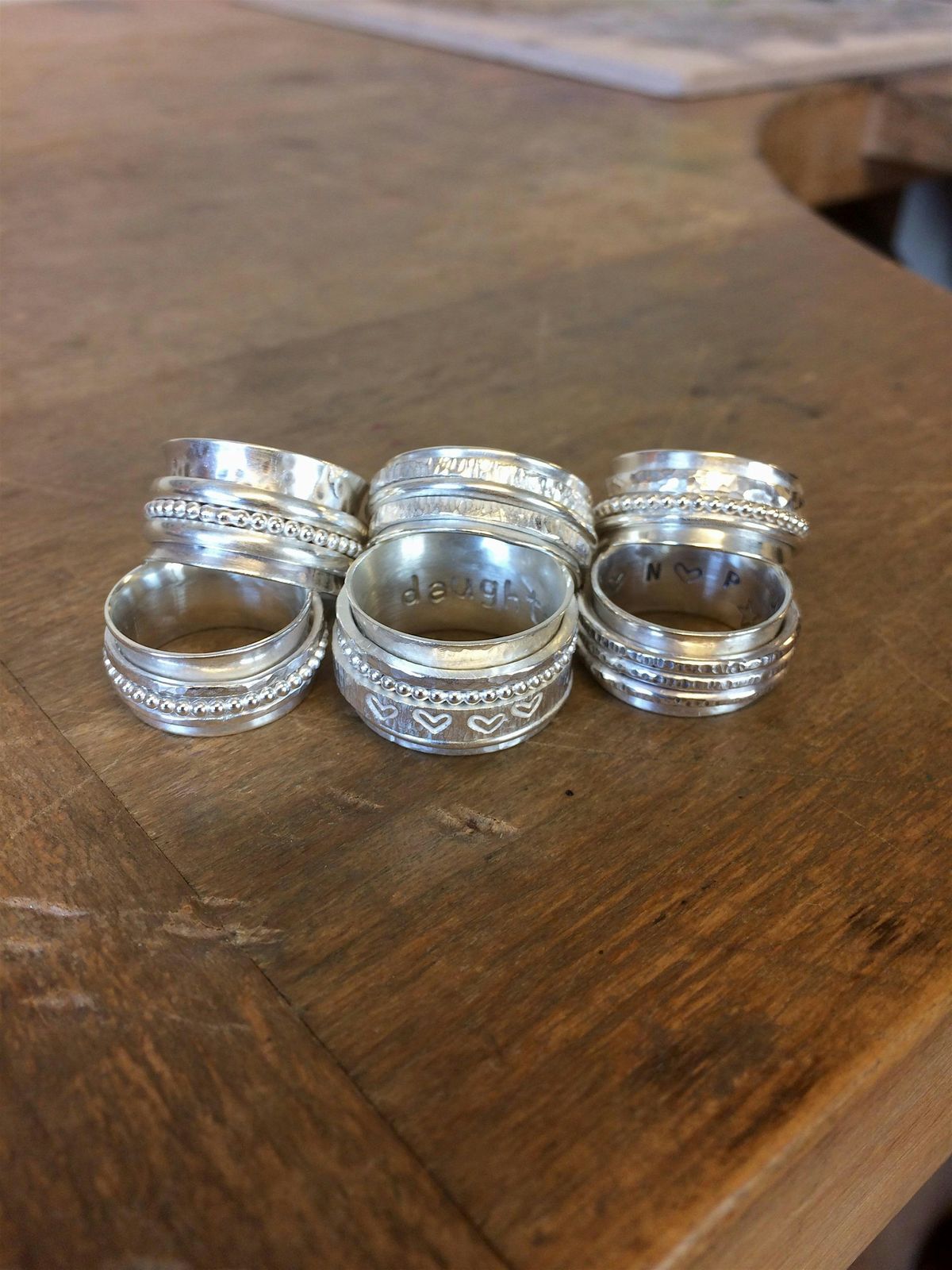 Make a fantastic spinner ring in a day - ideal for complete beginners. In this super-popular class you will use traditional silversmithing techniques to learn how to form a ring, solder, texture and polish, use chemical patina, and then go home wearing your creation. With lots of options for different combinations of textures, using decorative stamps and letter punches, different shapes of spinning bands and finishes each one is unique - the only difficulty is deciding what combination to make!