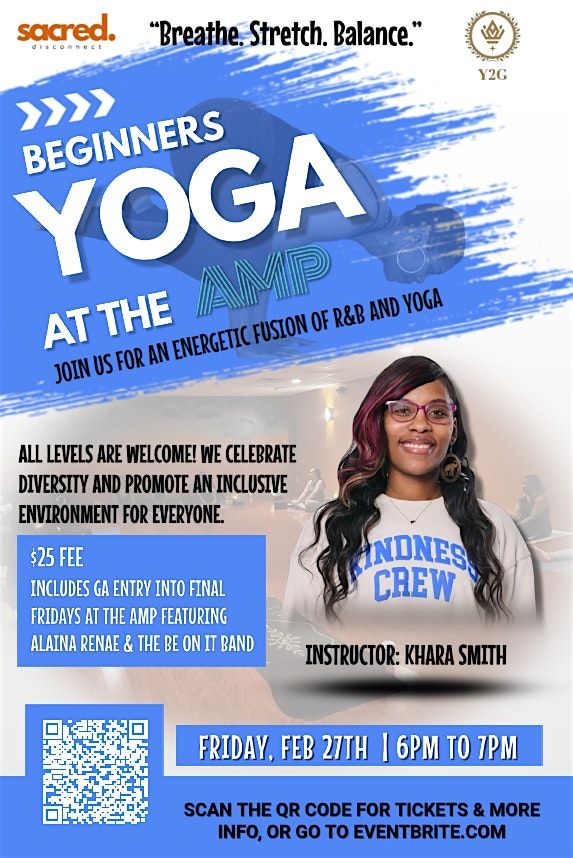 Join us for Beginners Yoga at the AMP, where wellness meets rhythm in an energetic fusion of R&B and yoga. Whether you're brand new to yoga or simply looking for a refreshing reset, this session welcomes all levels in a space that celebrates diversity, inclusion, and community.