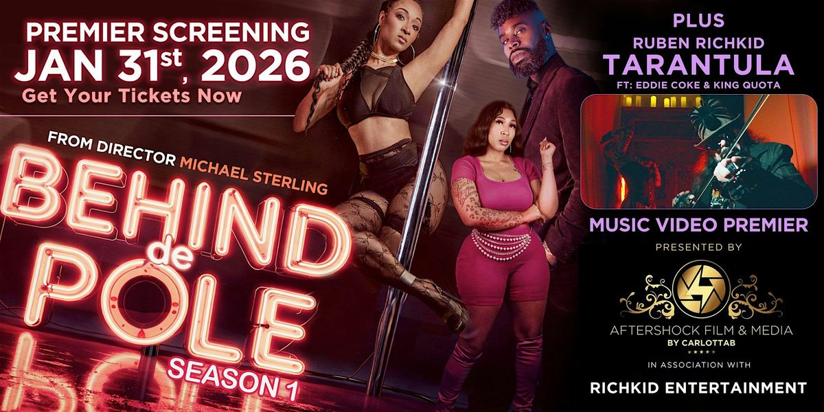 Be the first to watch Behind De Pole – Season 1, directed by Michael Sterling and produced by Carlotta B of Aftershock Film & Media, featuring Kyra Nabors, Sam Watkins, and Marika Joy. The night also includes the official premiere of the visually stunning “Tarantula” music video by Ruben Richkid, featuring Eddie Coke and King Quota.