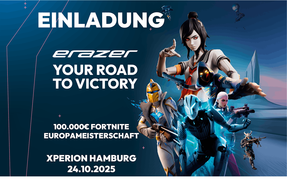 Im Rahmen einer Kooperation laden wir hiermit herzlich ein, das ERAZER Fortnite EM Finale live im XPERION in Hamburg kennenzulernen und hinter die Kulissen eines der grössten Fortnite Esports-Events in Europa zu blicken, dass am 25.10.25 ausgetragen wird.