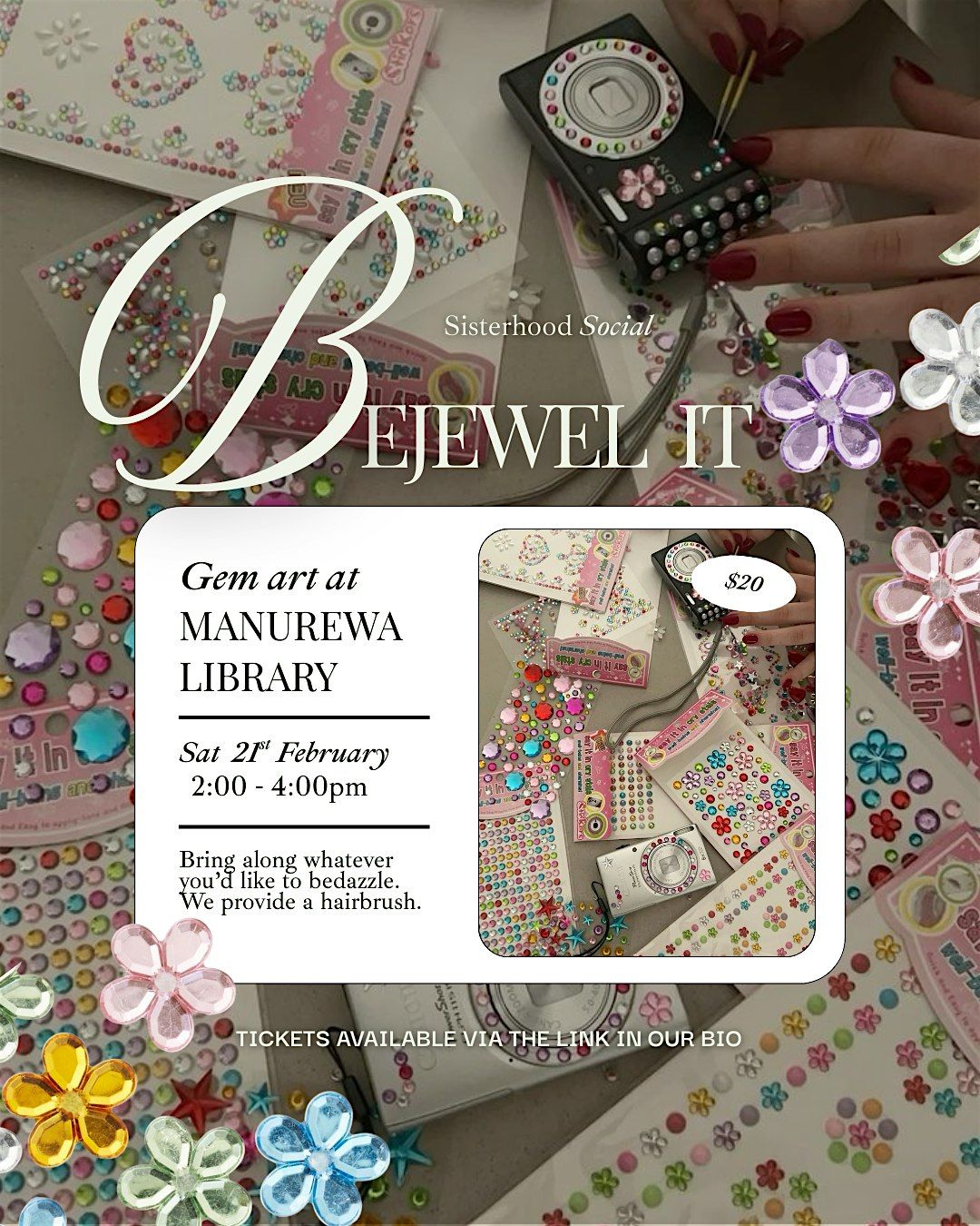 Welcome to Bejewel it! Get ready to unleash your creativity at the Manurewa Library on February 21, 2026 at 2:00 PM (Pacific/Auckland Time). Join us for a fun-filled afternoon bedazzling any accessory of your choice (bring from home), we provide each ticket holder with a cute hairbrush to bejewel with gem stones. Let's make some beautiful bling together!