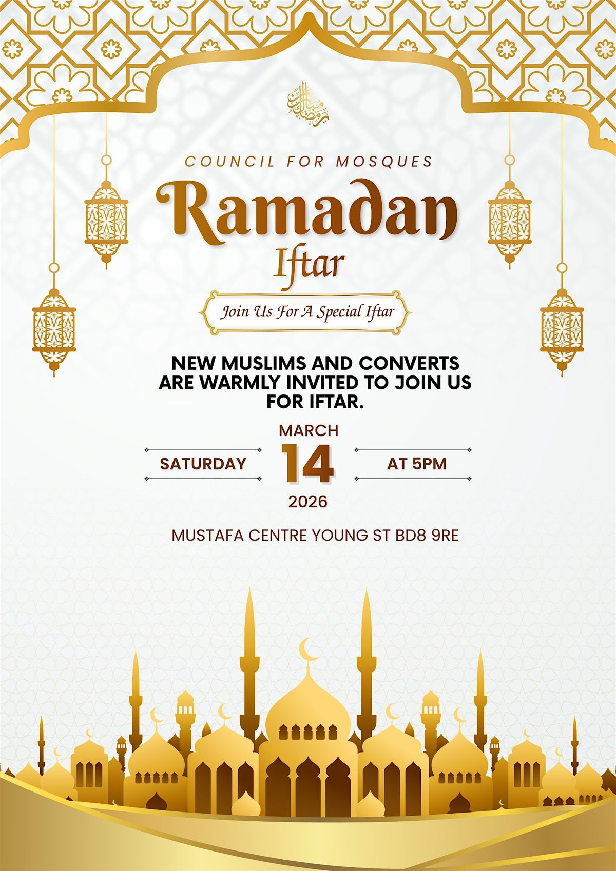 This event is a welcoming Iftar dedicated to new Muslims and converts, offering a relaxed and supportive space to break fast together. The evening aims to help attendees connect with others, build friendships, and feel a sense of belonging within the wider Muslim community. The Iftar will take place on Saturday 14th March at the Mustafa Centre, Young Street, BD8 9RE. Guests can expect a warm atmosphere, shared Iftar, and the opportunity to meet people who understand and support their journey in Islam.