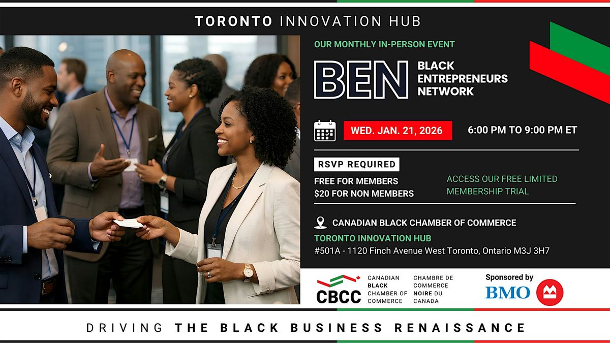 The Black Entrepreneurs Network (BEN) is the Canadian Black Chamber of Commerce's monthly in-person networking event, designed to bring Toronto's Black business community together in a dynamic, supportive environment.