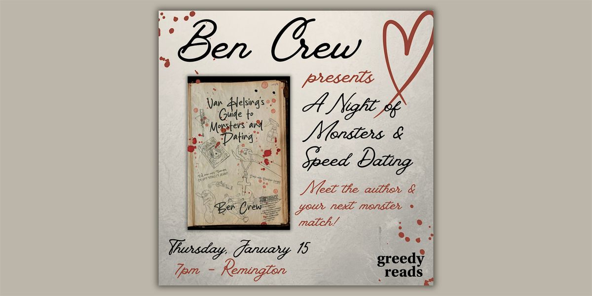 Join us on Thursday, January 15, in Remington for a night of monsters and speed dating! Ben Crew, author of Van Helsing's Guide to Monsters and Dating, will present his novel while leading rounds of monster-themed speed dating!