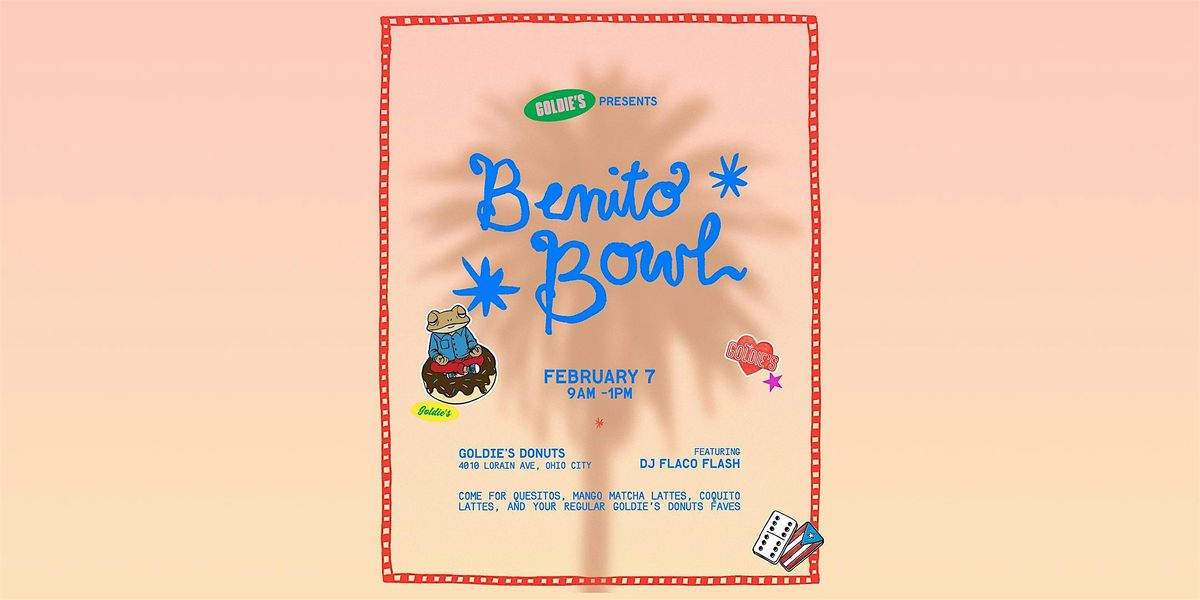 Benito Bowl will feature DJ Flaco Flash for music and the Young Latino Cleveland Network to assist anyone in registering to vote. Plus, enjoy quesitos de guava, coquito lattes, mango lattes, and, of course, your favorite Goldie's goodies and treats.