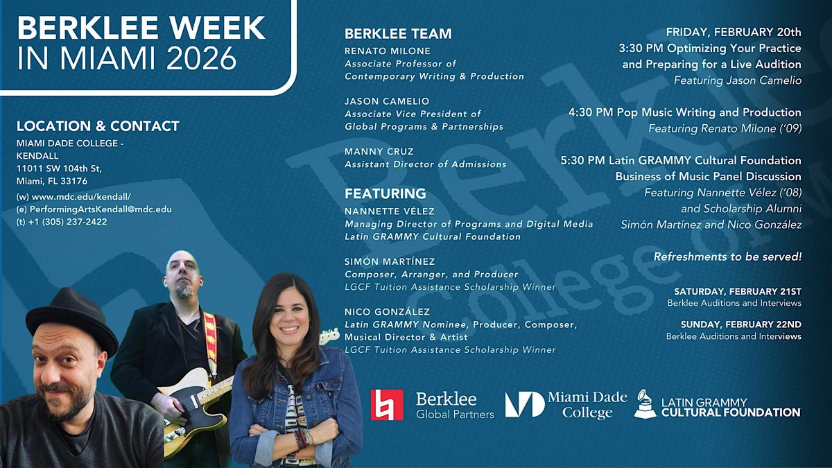 Don't miss out on this awesome in-person event where you can dive into the world of music with Berklee's experts and special guests from the Latin GRAMMY Cultural Foundation. Sessions will include preparing for an audition, music production and careers in the music industry. Learn about the credit transfer pathway from Miami Dade College associates degree to Berklee College of Music undergraduate degree -- as well as scholarship opportunities from Berklee and the Latin GRAMMY Cultural Foundation!!