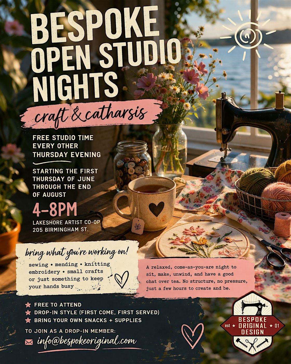 Sew, mend, knit, paint, take apart or just keep your hands busy — chat, sip tea, or work quietly.No pressure. Just a cozy space to make.Free | Drop-in | BYO snacks + supplies#BespokeOriginal #OpenStudioNights #CraftAndCatharsis #TorontoMakers #Etobicoke #SewingLife #CreativeNights