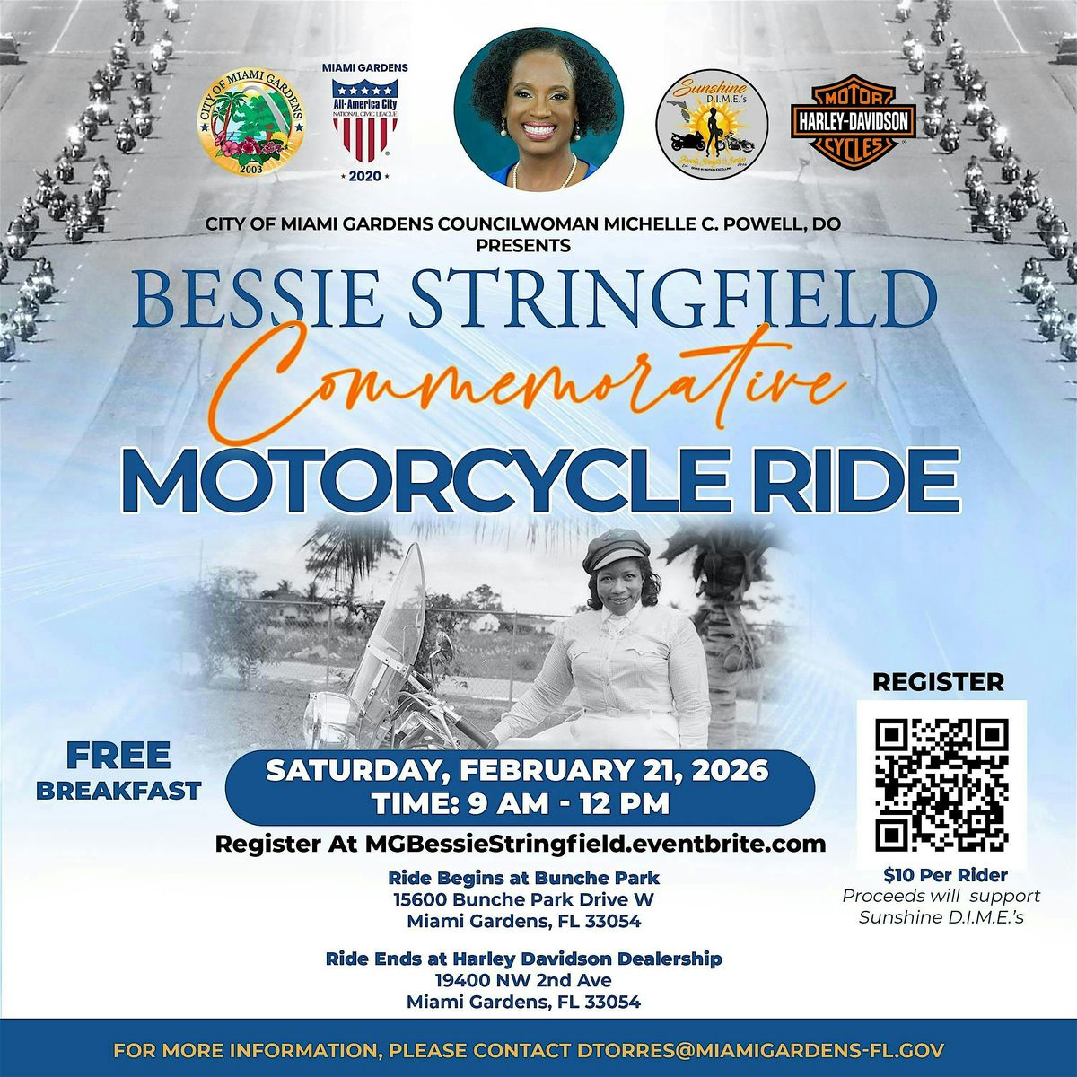 Welcome riders! Join us for the Bessie Stringfield Commemorative Motorcycle Ride at Bunche Park on February 21, 2026 at 9:00 AM (Eastern Time). Let's honor the legacy of the legendary motorcyclist Bessie Stringfield together. Get ready to hit the road and enjoy a scenic ride with fellow enthusiasts. Don't miss out on this unforgettable experience!