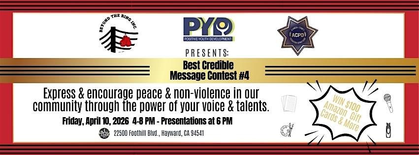 Join us for Alameda County Probation Department's Best Credible Message Contest — Contest #4, a powerful community event encouraging youth voices to promote peace, harmony, and non-violence through creativity and self-expression.