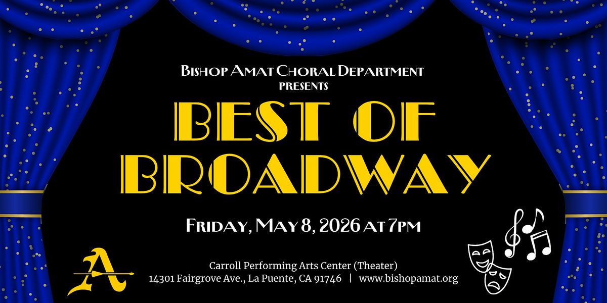 Experience the Best of Broadway, a one-night-only event presented by the Bishop Amat Choral Department. This unforgettable evening celebrates the magic of musical theater, featuring iconic songs from beloved Broadway shows such as West Side Story, Newsies, Aladdin, Wicked, and more.