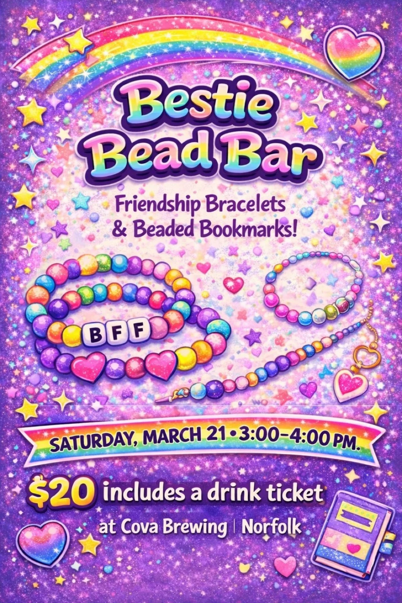 Join us during Cova's Boozy Book Fair for this beaded workshop. We will be making bracelets and bookmarks. Ticket includes one drink ticket.