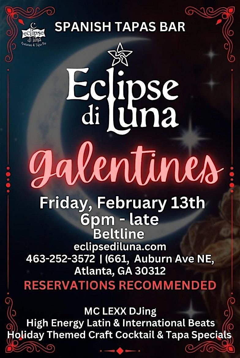 Grab your girls and get ready to SLAY this Galentines! We're turning up the heat at Eclipse di Luna with an epic night of non-stop Latin & international beats spun by our fire DJ, mouthwatering Spanish tapas that'll have you dancing on air, and all the laughter, selfies, and pure bestie magic you can handle! Featuring many themed tapa and craft cocktail specials! 🌙🍷