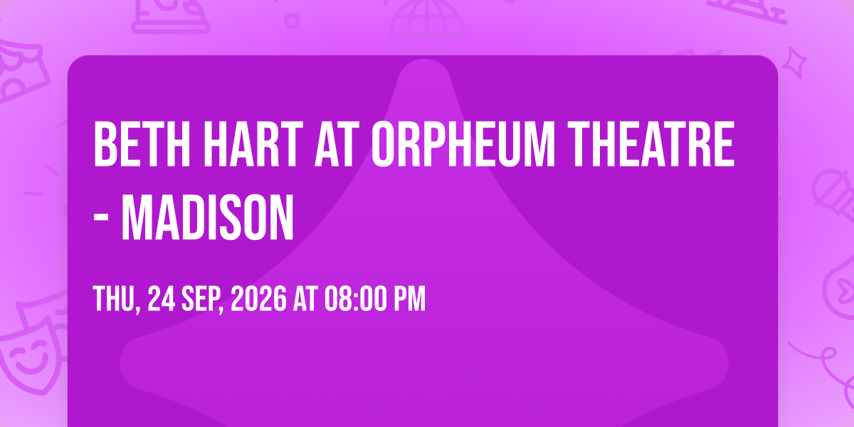 β¨ Enter a world of endless possibilities at Beth Hart at Orpheum Theatre - Madison, where every moment tells a story! ποΈ The stunning Orpheum Theatre - Madison in vibrant Madison, WI transforms into a realm of wonder on September 24th, 2026 at 08:00 PM. π They have crafted an experience that goes beyond the ordinary, combining elements of surprise, delight, and pure entertainment. Every detail has been thoughtfully considered to ensure your journey with us is nothing short of extraordinary. π― Join fellow adventure seekers and memory makers in this celebration of imagination and innovation. π Reserve your spot today and be part of something truly special!