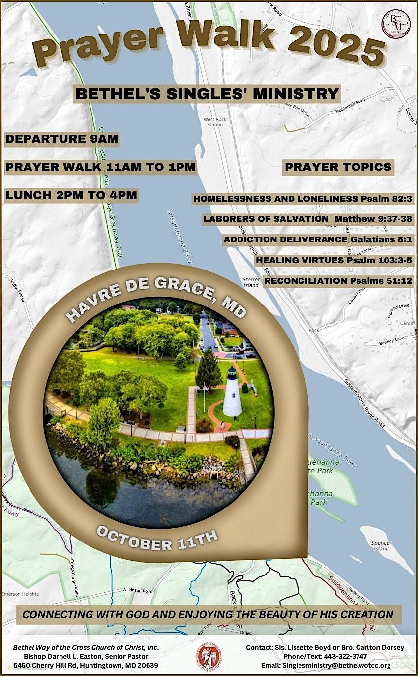 On October 11, join BWOTCC Singles' Ministry for a powerful time of prayer, worship, and fellowship. We will be travelling to Havre de Grace, MD for our annual prayer walk. Addiction, loneliness, healing, and reconciliation are only a few topics that will be addressed during our prayer time. The prayer walk will begin promptly at 11AM followed by lunch at 2PM.