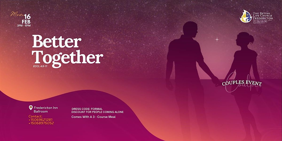 Better Together is a Valentine-season gathering created for Christian married couples to celebrate love, unity, and God’s design for marriage. Hosted by The Better Life Church, this elegant evening invites couples to dress formally and enjoy an intentional space to reconnect, reflect, and strengthen their relationship in a Christ-centered environment.