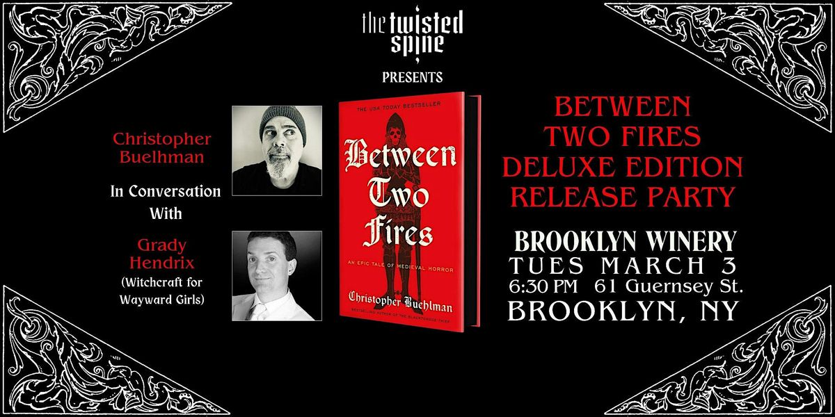 The Twisted Spine is so excited to celebrate the eagerly anticipated hardcover release of BETWEEN TWO FIRES, the sensational medieval horror epic by USA TODAY bestselling author Christopher Buehlman! Join us at nearby Brooklyn Winery for a one-night only event, featuring a conversation with Christopher Buehlman and Grady Hendrix, followed by a signing line and an opportunity to meet the authors. Please see below for important ticket and event information.