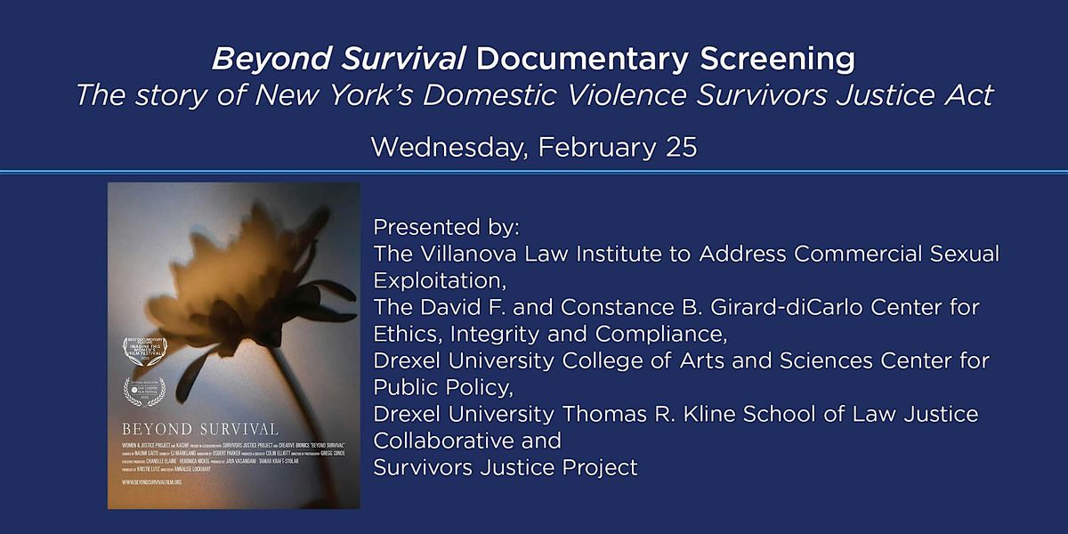 The David F. and Constance B. Girard-diCarlo Center for Ethics, Integrity and Compliance, The Villanova Law Institute to Address Commercial Sexual Exploitation, The Drexel University's Thomas R. Kline School of Law Justice Collaborative and Drexel University's College of Arts and Sciences Center Public Policy present "Beyond Survival" Documentary Screening, the story of New York's Domestic Violence Survivors Justice Act.