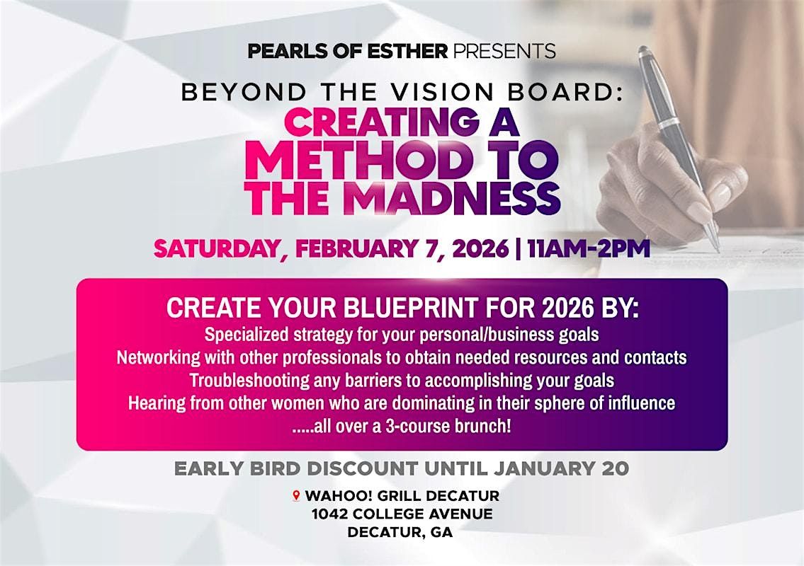You have the vision board.....now what? The vision board is the first step in bringinhg your dreams to reality, not the final destination. Without a vision and STRATEGY, the vision board will remain on paper with no solid plan to execute. This is where we come in! Beyond the Vision Board is an event that has proven to help women no matter what their area of expertise/interest is to gather the necessary tools, resources and knowledge to move their goals from paper to materialization. How does this event do it? By realizing that when we gather, we have the knowledge, tools and resources IN THE ROOM to lift one another and strategize. If you are ready to move from the vision board to seeing your dreams/goals materialize in 2026, join us! Ticket includes a Goal Strategizing Workbook and 3-Course Brunch!
