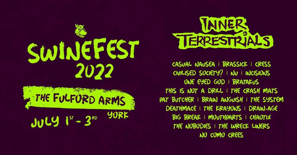 Swinefest is back for its fifth year at the Fulford Arms this July featuring bands from all across the UK over three days.Friday evening will be at the Fully followed with an all-dayer on the Saturday. On the Sunday were running the punx picnic and BBQ down the river early afternoon to ease the hangovers, before returning back to the Fulford in the evening to end it in style.