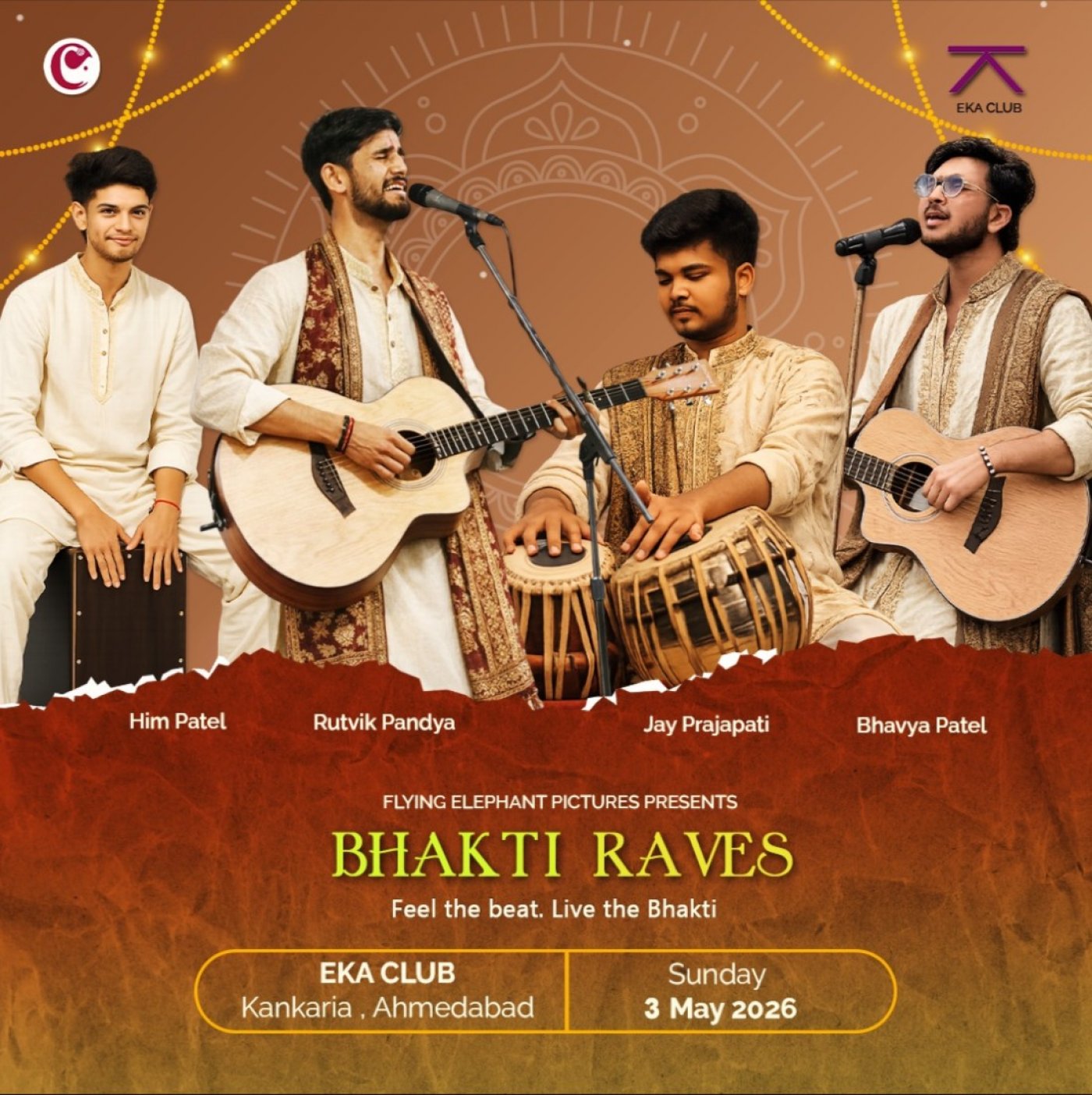 Step into a musical fusion of divinity and beats at "Bhakti Raves - A Bhajan Clubbing Show" brought to you by Flying Elephant Pictures. Join us on May 3rd at the enchanting EKA Club, Lake Gate.3, Kankaria, Ahmedabad for an unforgettable experience.