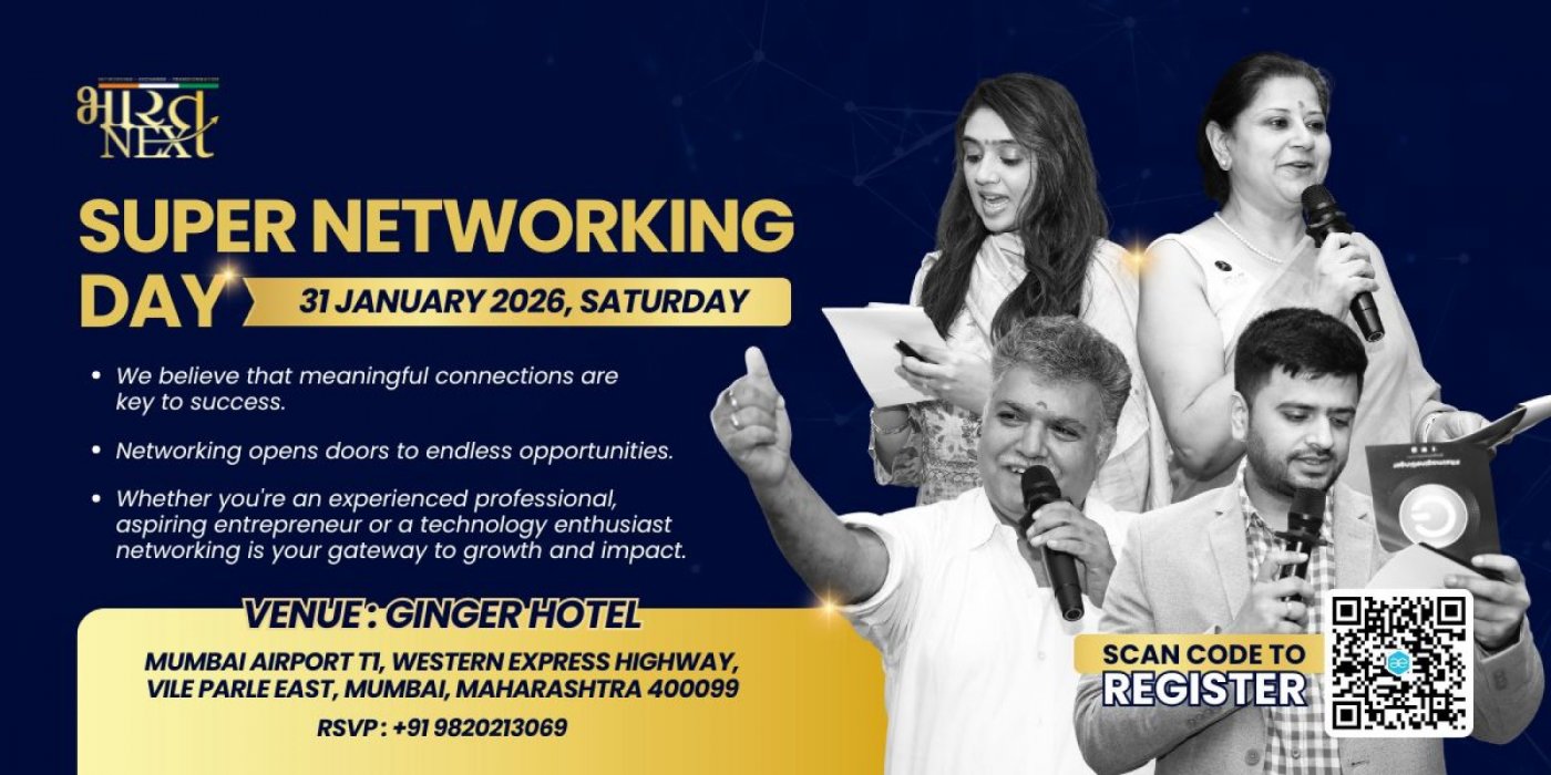 Step into the future of networking at the BHARATNEXT SUPERNETWORKING DAY! Join us at Ginger Hotel near Santacruz Airport on january 31st 2026 at 07:15 AM in Mumbai Maharashtra for an event like no other.