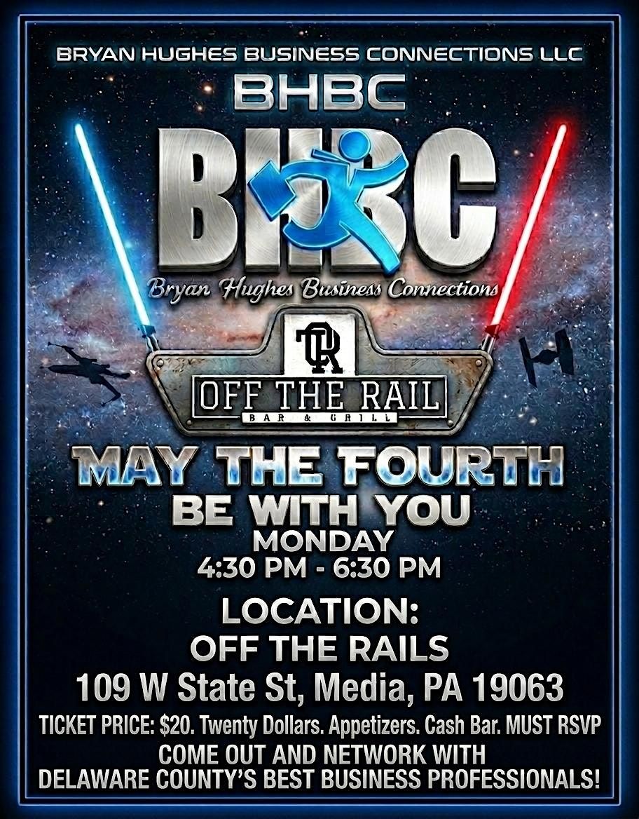 Join Bryan Hughes Business Connections LLC (BHBC) at the legendary Off the Rail Bar & Grill for our May the Fourth Networking Mixer! This is your chance to expand your professional network, build relationships, and connect with Delaware County’s best business professionals—no lightsaber skills required (but Jedi attire is encouraged!).